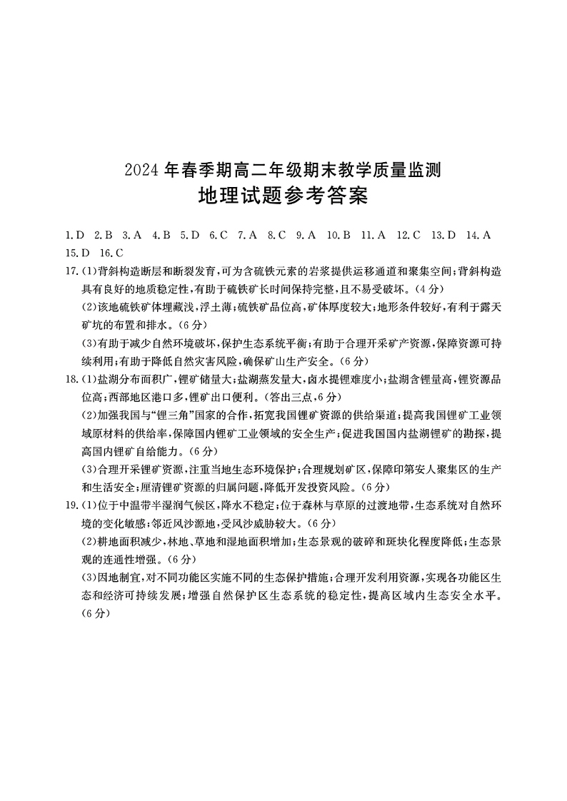 广西壮族自治区贵港市高2025届下学期期末教学质量监测地理答案