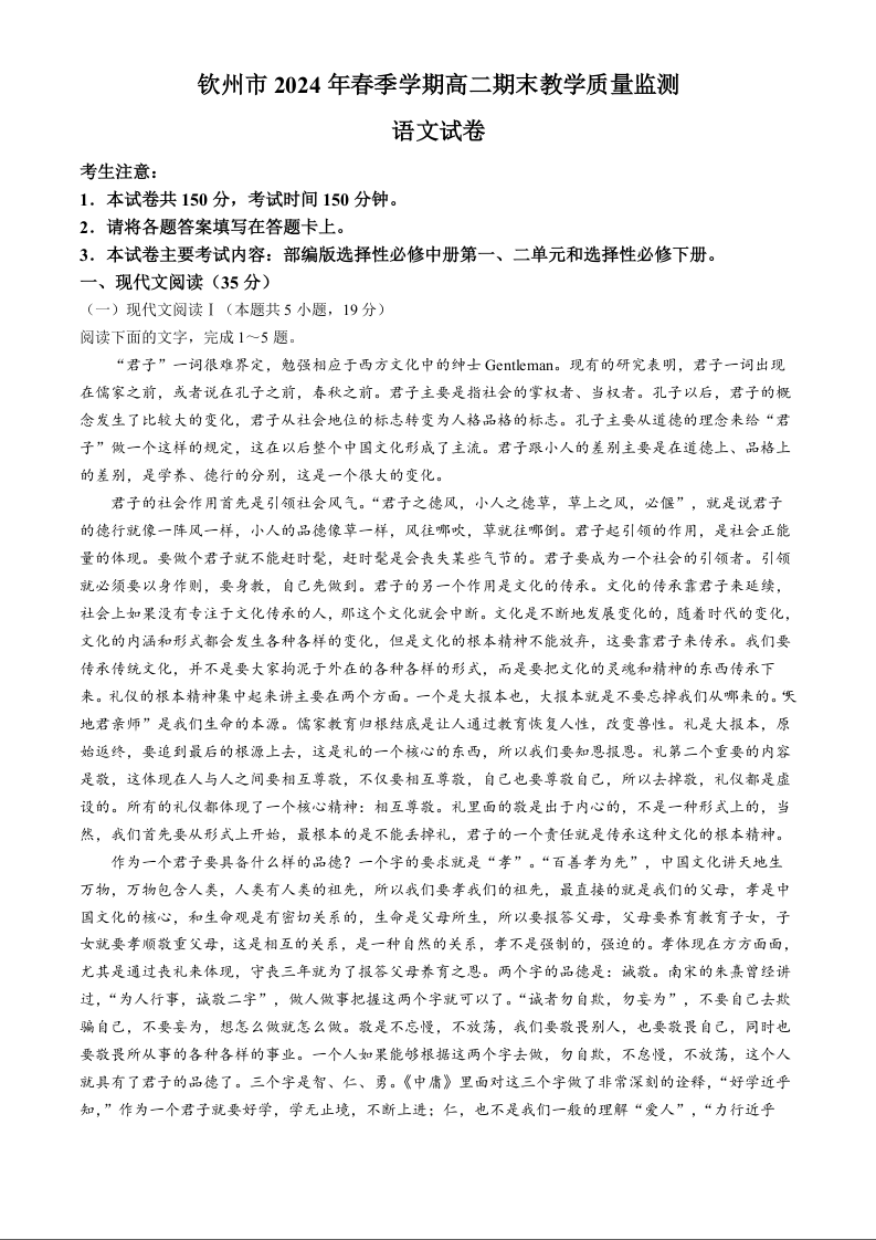 广西壮族自治区钦州市2024年春季学期高二期末教学质量监测语文+答案