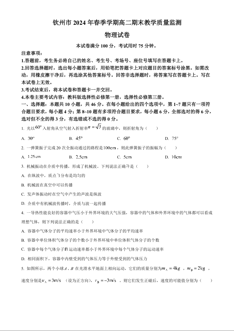 广西壮族自治区钦州市2024年春季学期高二期末教学质量监测物理+答案