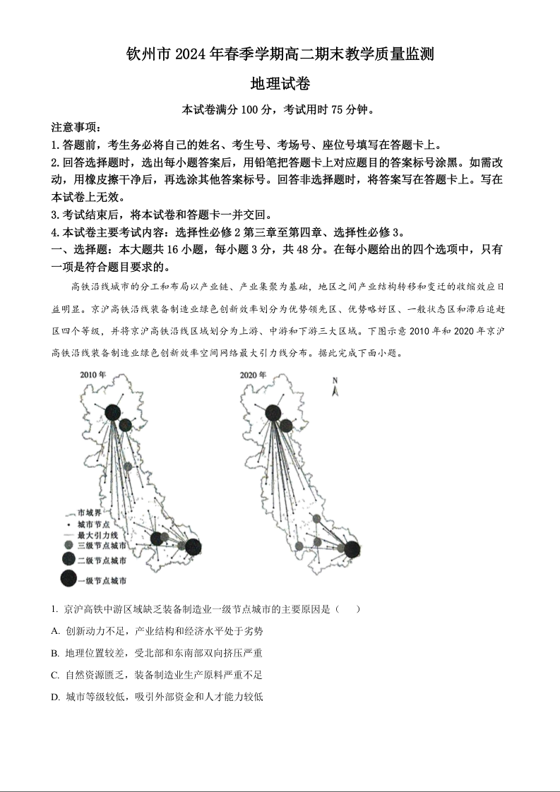 广西壮族自治区钦州市2024年春季学期高二期末教学质量监测地理+答案