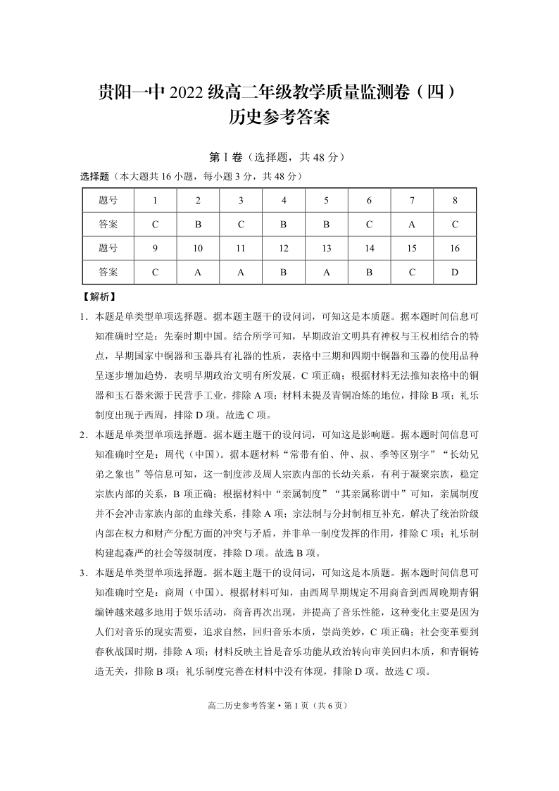贵州省贵阳市第一中学高二下学期第四次月考历史答案