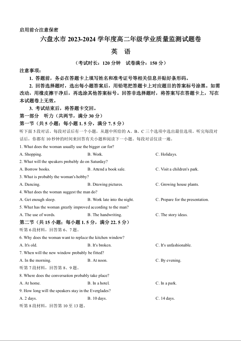 贵州省六盘水市2023-2024学年度高二年级学业质量监测试英语+答案