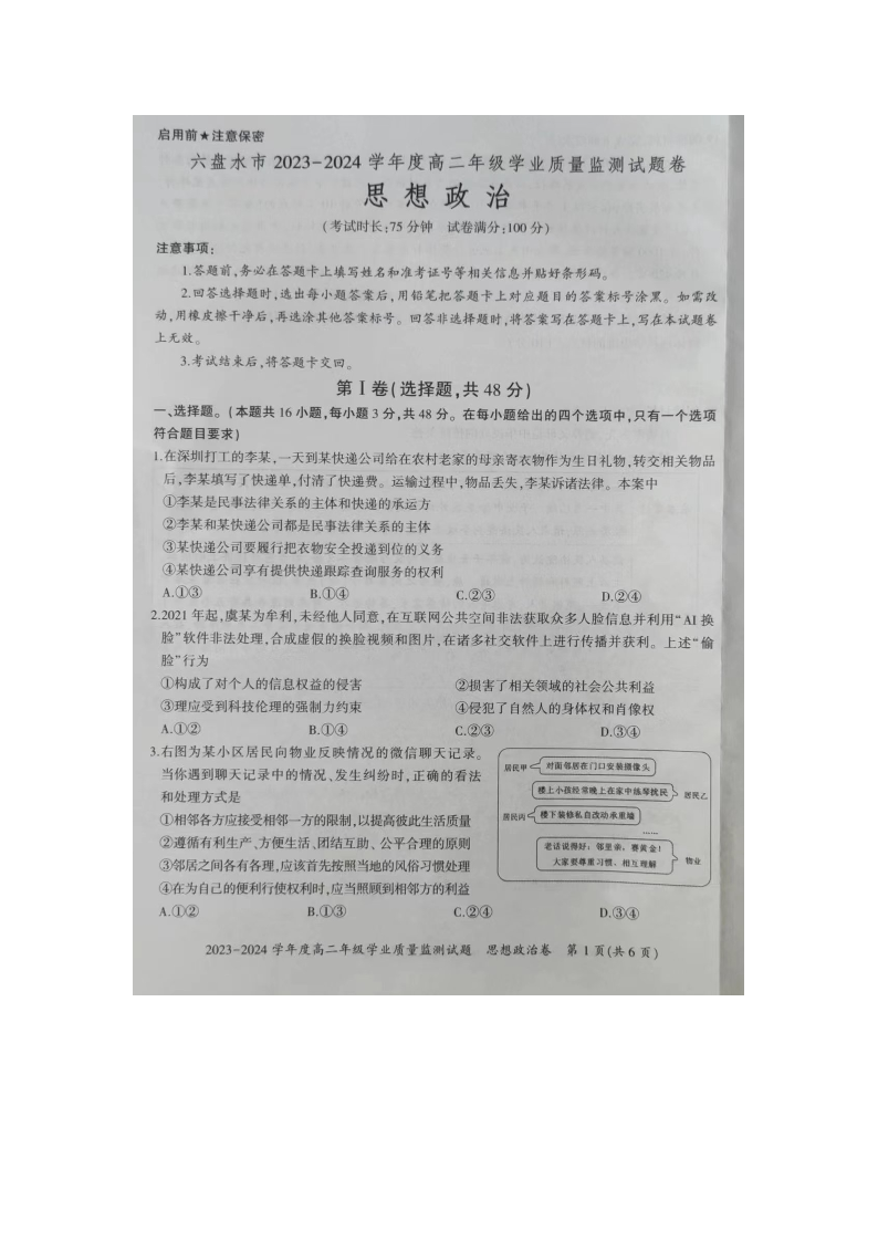 贵州省六盘水市2023-2024学年度高二年级学业质量监测试政治+答案