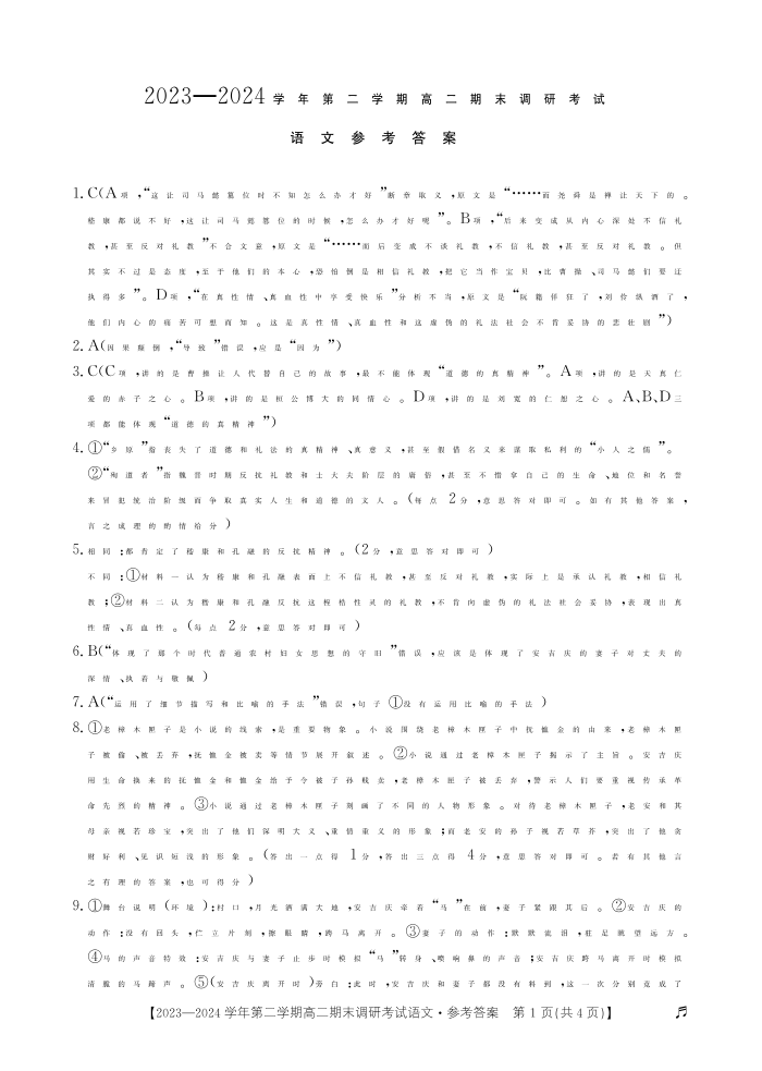 河北省保定市2023—2024学年第二学期高二期末调研考试语文答案