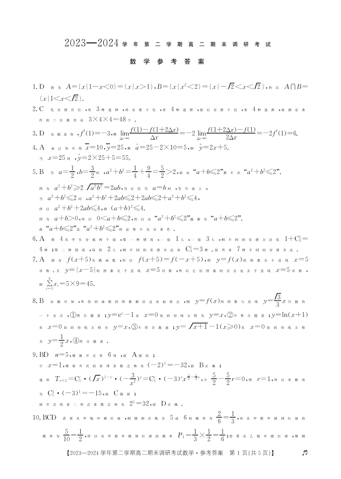 河北省保定市2023—2024学年第二学期高二期末调研考试数学答案