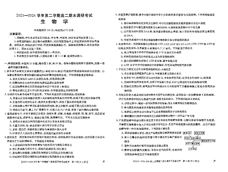 河北省保定市2023—2024学年第二学期高二期末调研考试生物