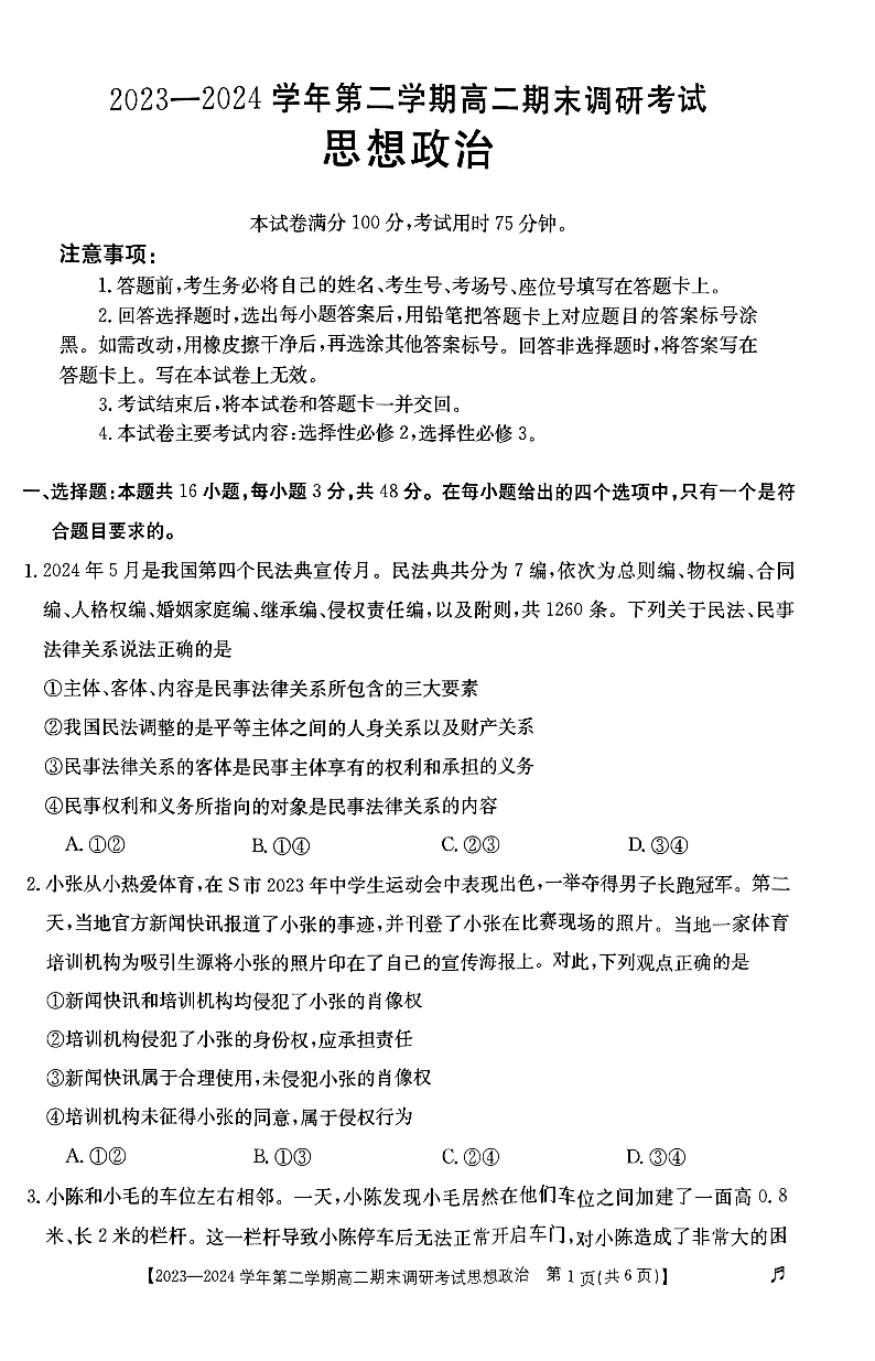 河北省保定市2023—2024学年第二学期高二期末调研考试政治
