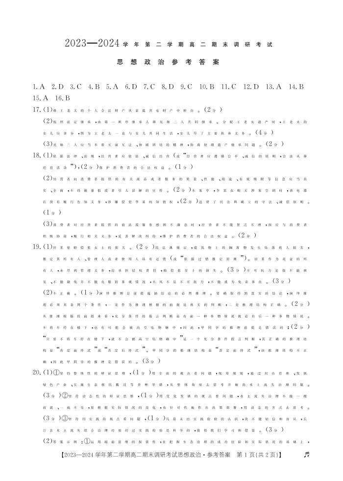 河北省保定市2023—2024学年第二学期高二期末调研考试政治答案