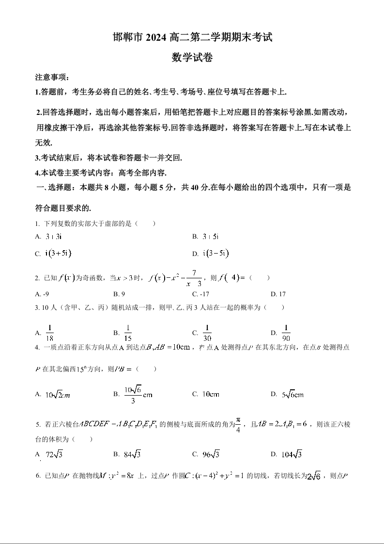 河北省邯郸市2024高二第二学期期末考试数学