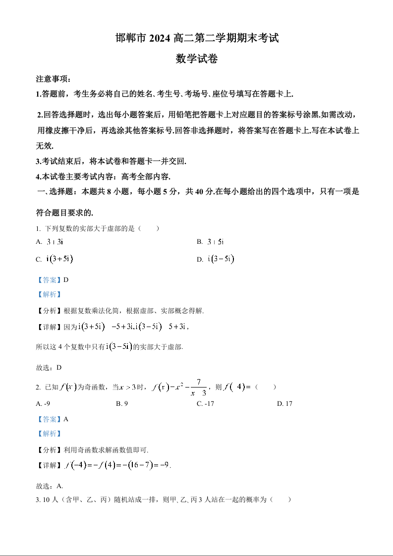 河北省邯郸市2024高二第二学期期末考试数学答案