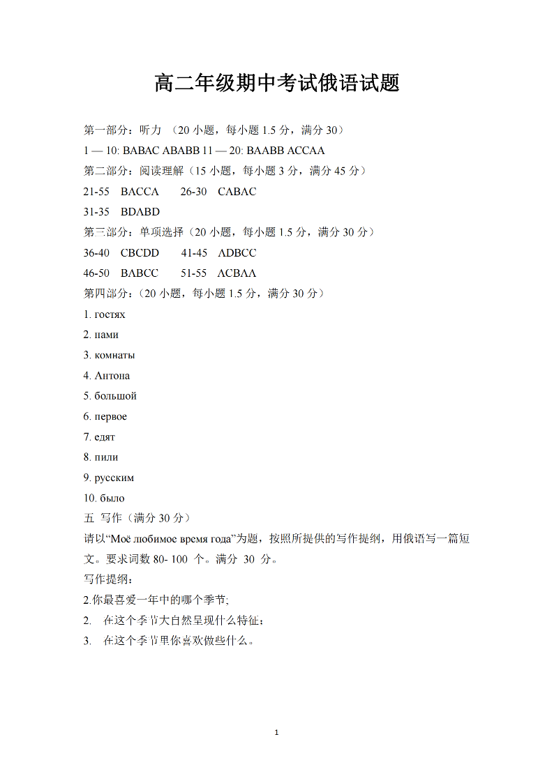 河北省邯郸市2024高二第二学期期末考试俄语答案