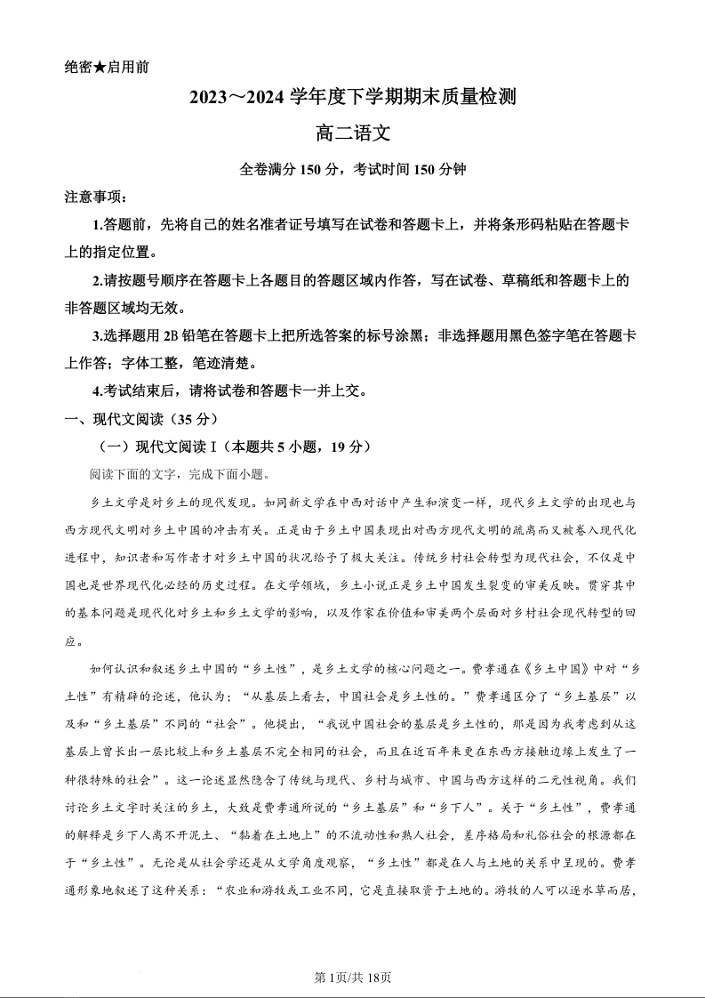 河南金科新未来2023~2024学年度下学期期末质量检测语文(精品解析版)