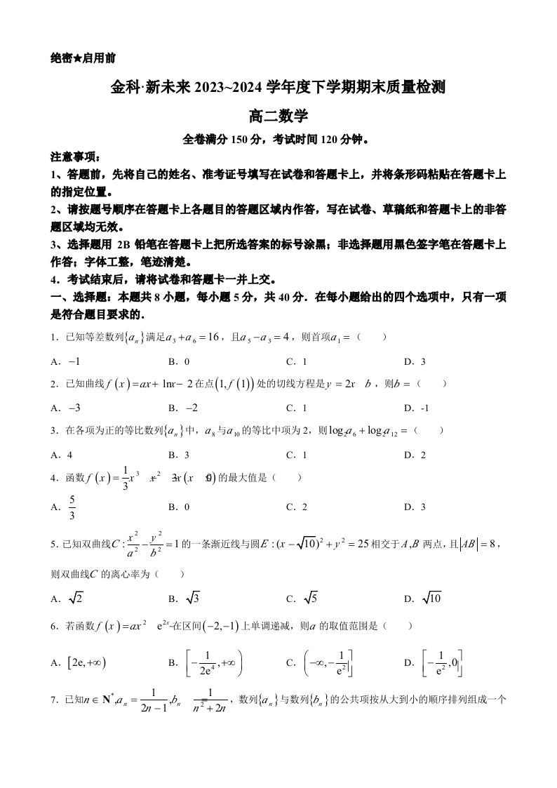 河南金科新未来2023~2024学年度下学期期末质量检测数学+答案