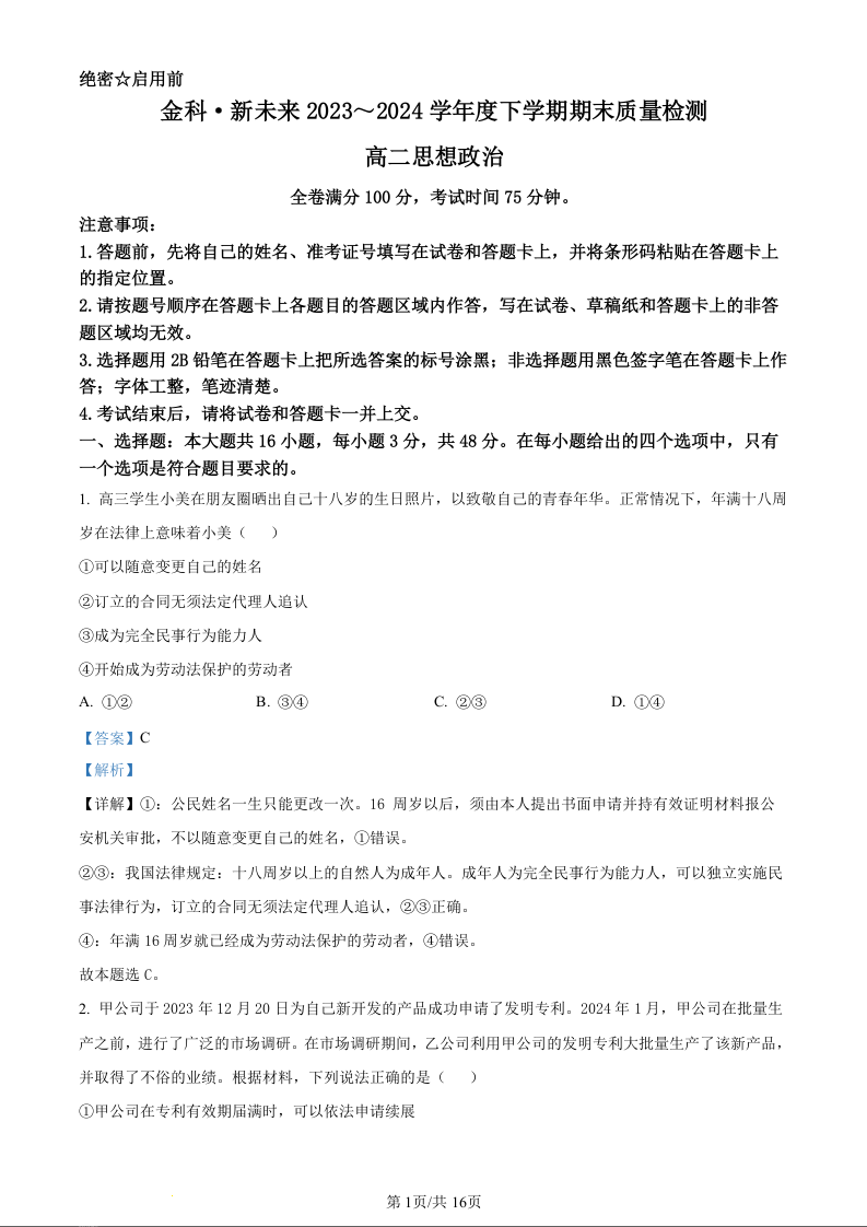 河南金科新未来2023~2024学年度下学期期末质量检测政治(精品解析版)