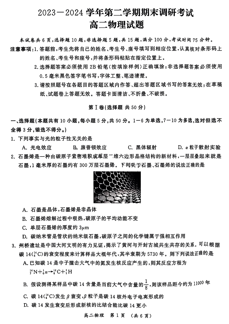 河南省开封市高2025届学期高二期末调研考试物理+答案