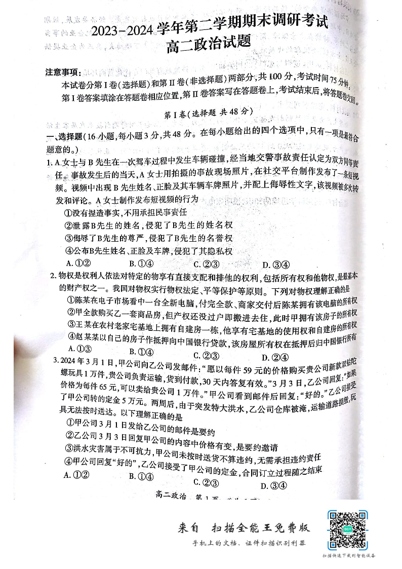 河南省开封市高2025届学期高二期末调研考试政治