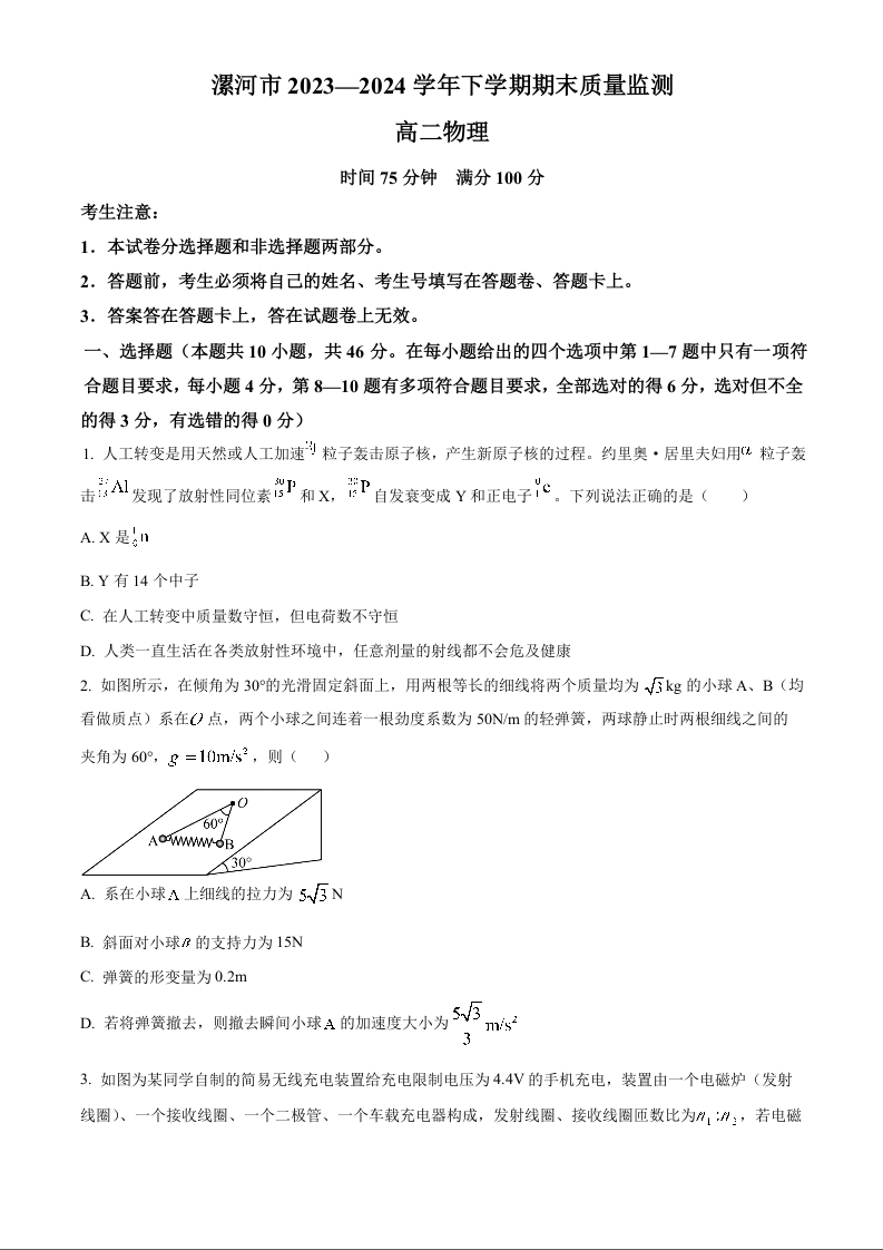 河南省漯河市2023-2024学年高二下学期期末质量监测物理+答案