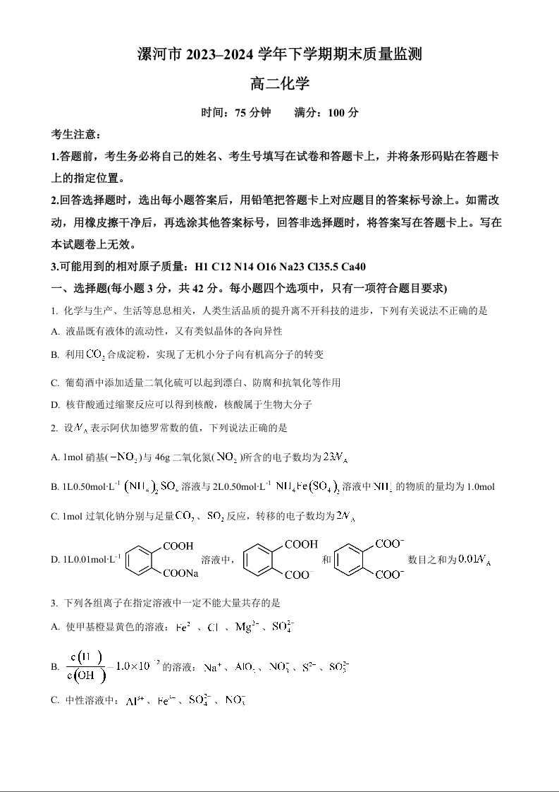 河南省漯河市2023-2024学年高二下学期期末质量监测化学+答案