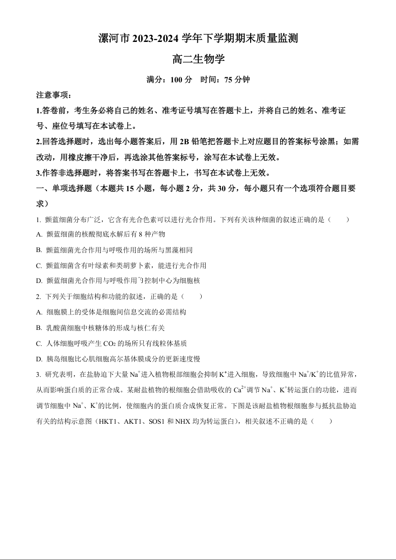 河南省漯河市2023-2024学年高二下学期期末质量监测生物+答案