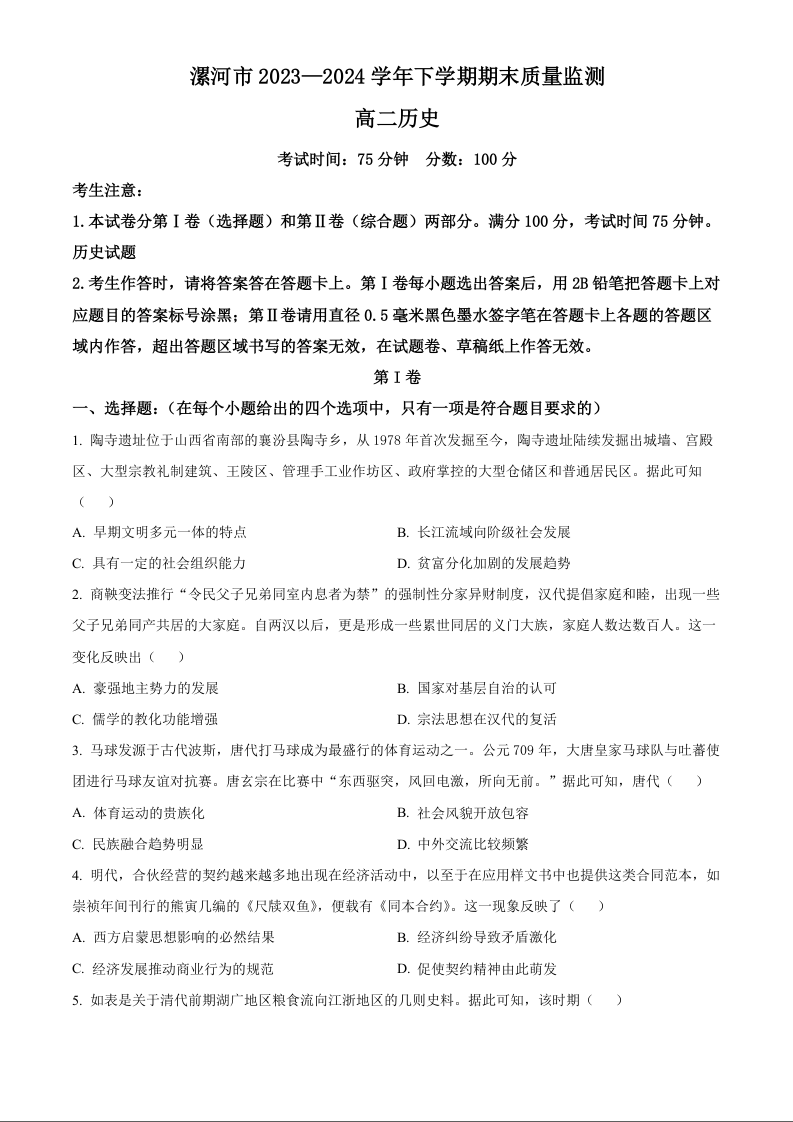 河南省漯河市2023-2024学年高二下学期期末质量监测历史+答案