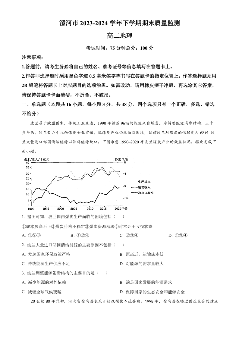河南省漯河市2023-2024学年高二下学期期末质量监测地理+答案
