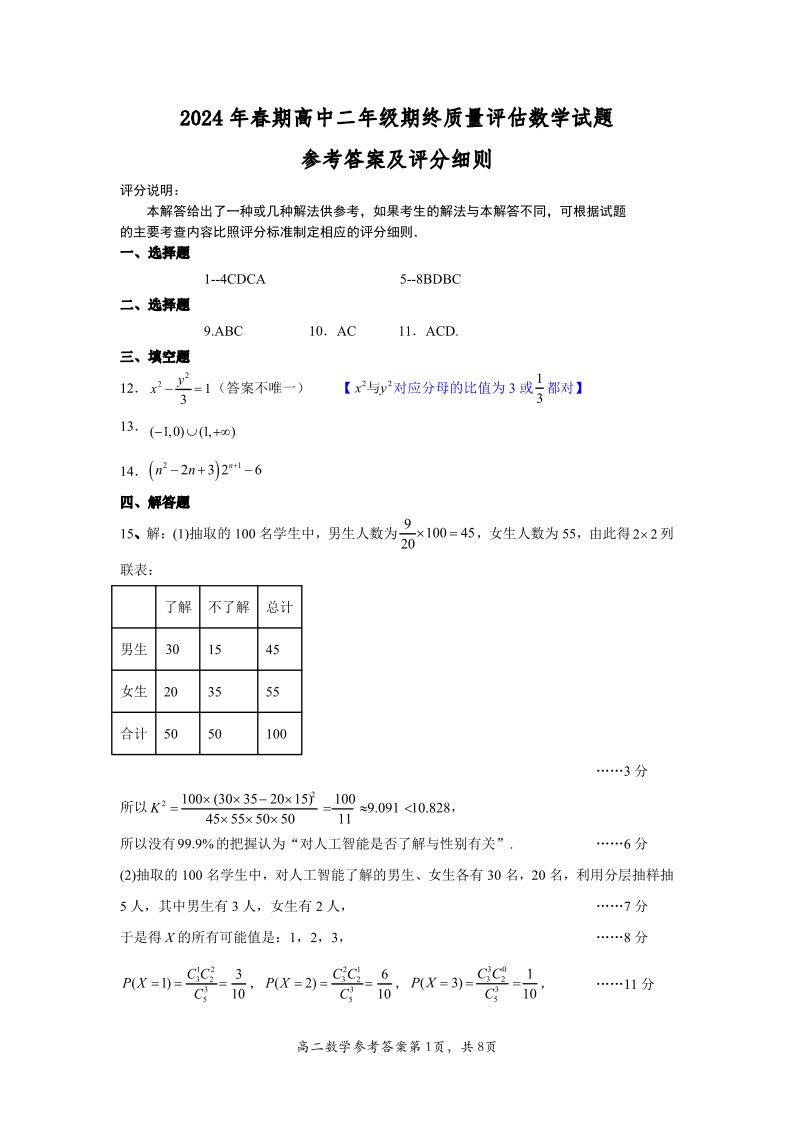 河南省南阳市2024年春期高中二年级期终质量评估数学答案