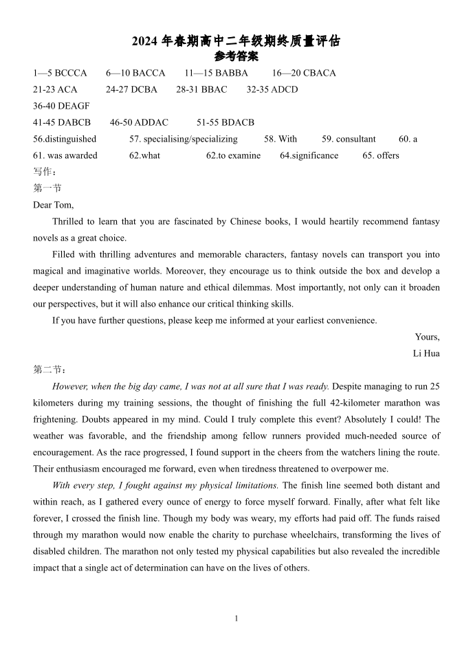 河南省南阳市2024年春期高中二年级期终质量评估英语答案