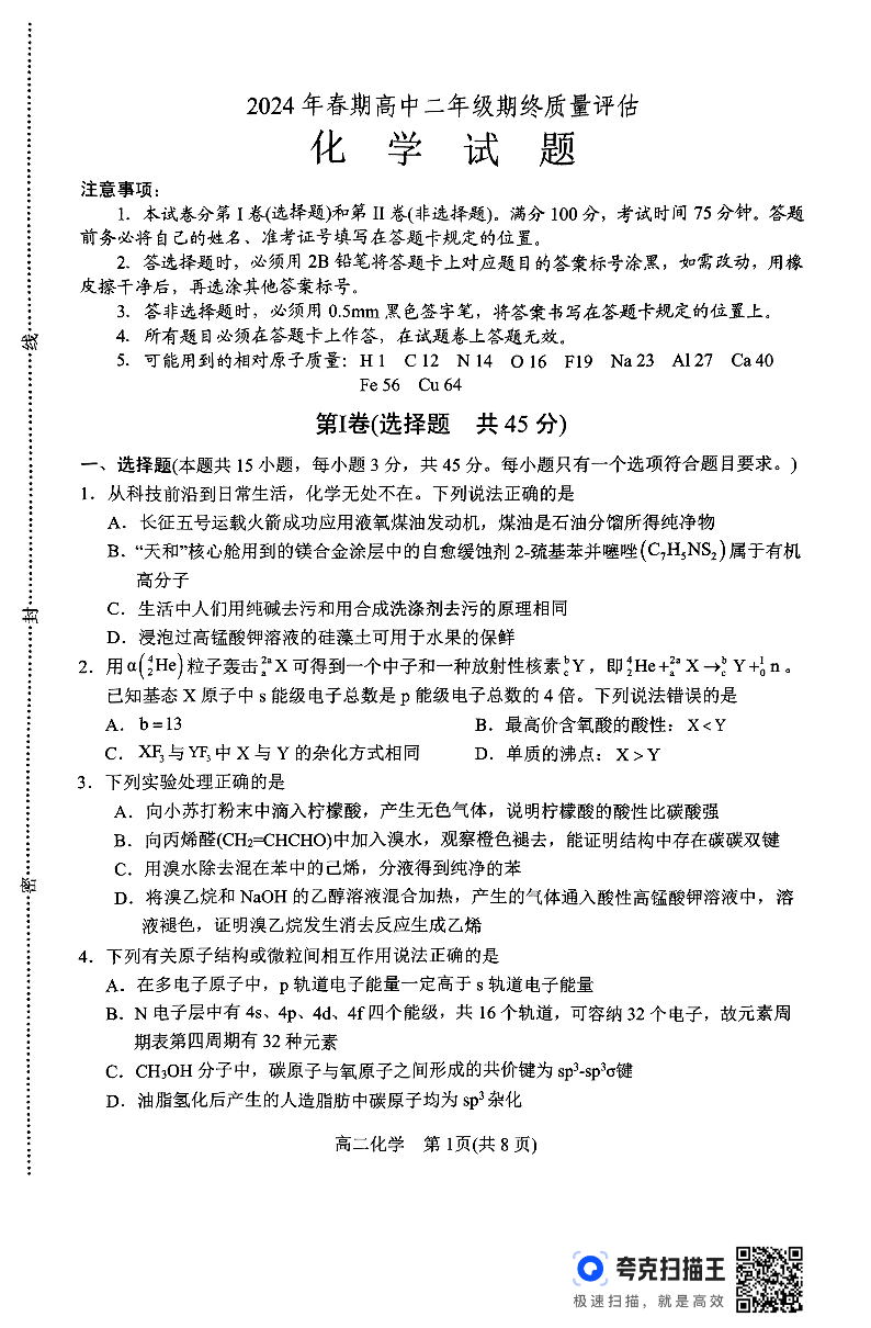 河南省南阳市2024年春期高中二年级期终质量评估化学
