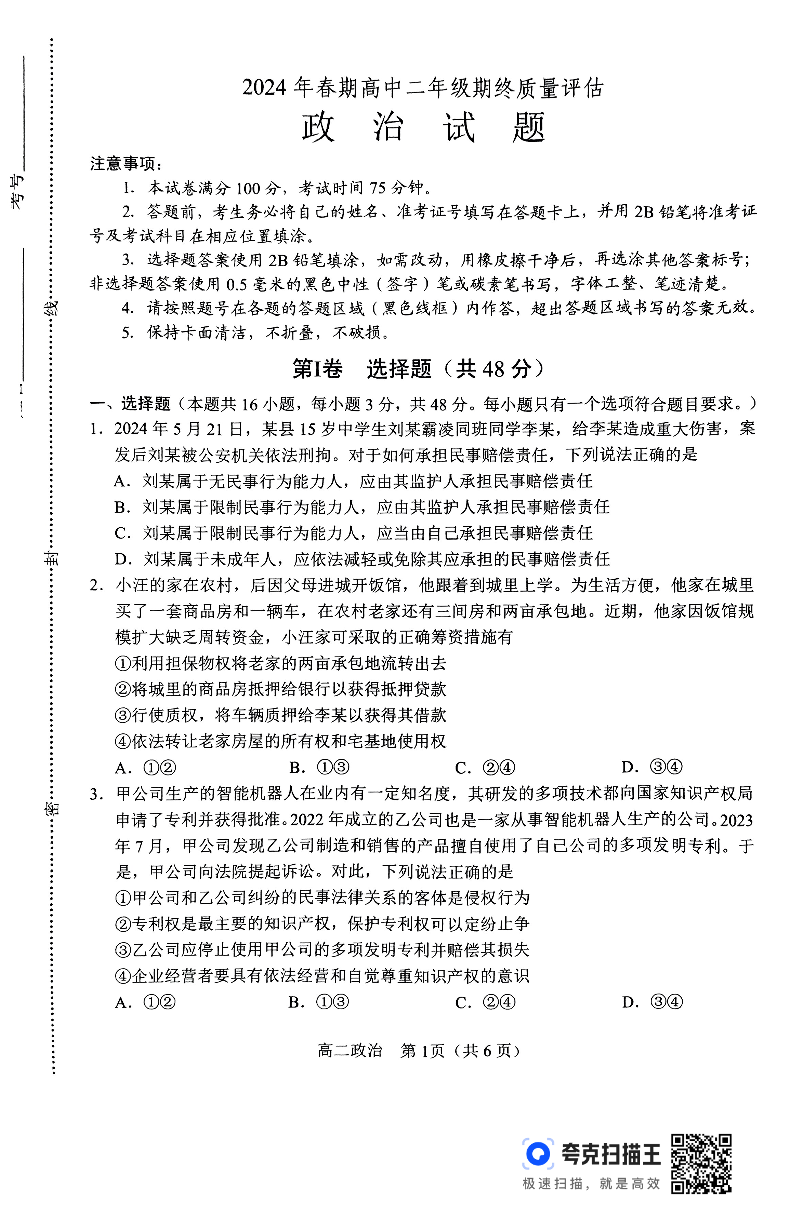 河南省南阳市2024年春期高中二年级期终质量评估政治