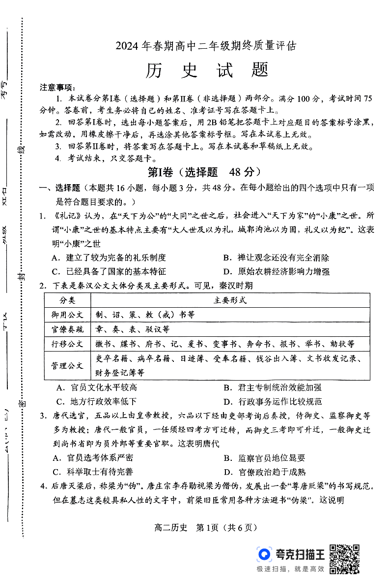 河南省南阳市2024年春期高中二年级期终质量评估历史