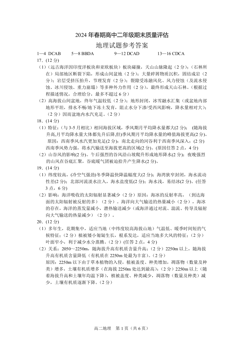 河南省南阳市2024年春期高中二年级期终质量评估地理答案