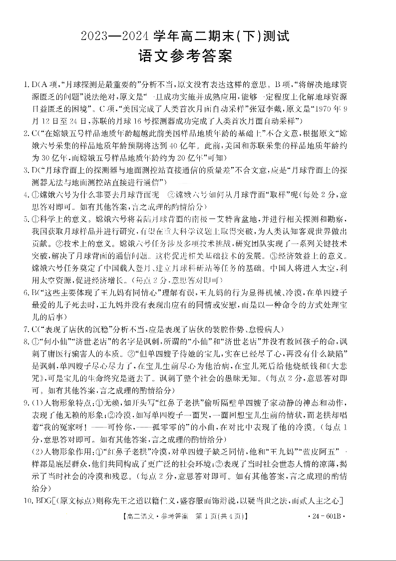 河南省新乡市2023-2024学年高二下期末(下)测试物理语文答案