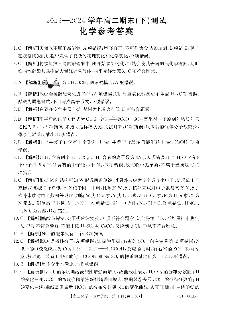 河南省新乡市2023-2024学年高二下期末(下)测试化学答案