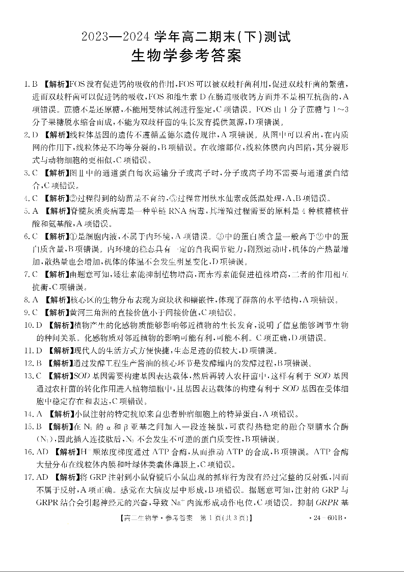 河南省新乡市2023-2024学年高二下期末(下)测试生物答案