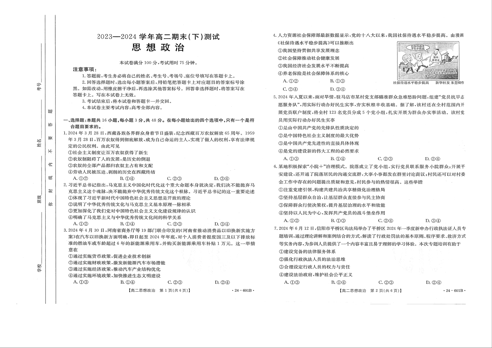 河南省新乡市2023-2024学年高二下期末(下)测试政治