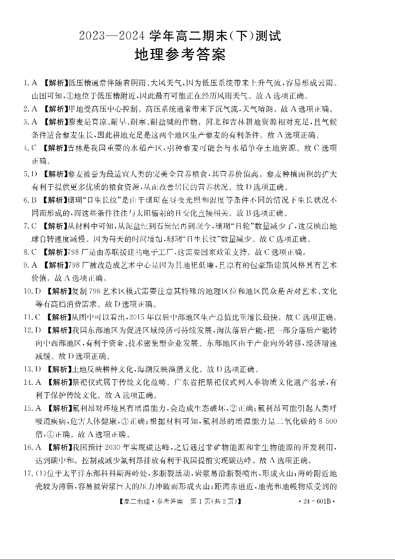 河南省新乡市2023-2024学年高二下期末(下)测试地理答案