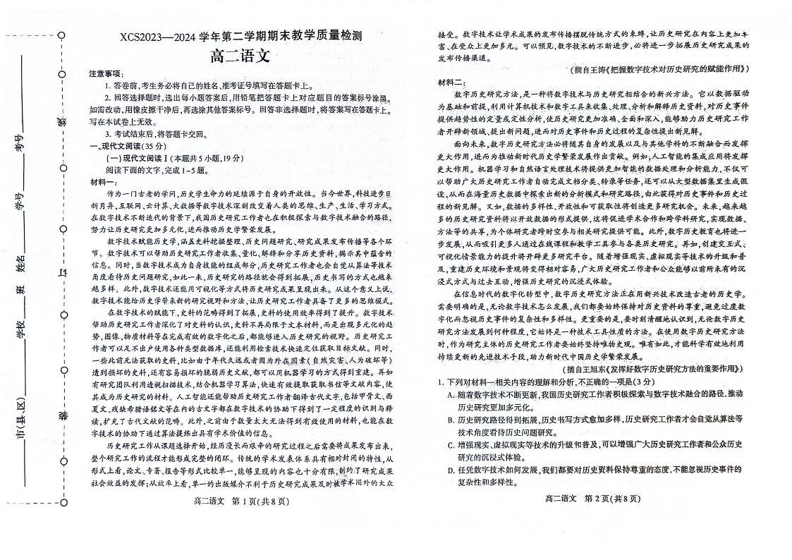 河南省许昌市高2025届下学期7月期末教学质量检测语文