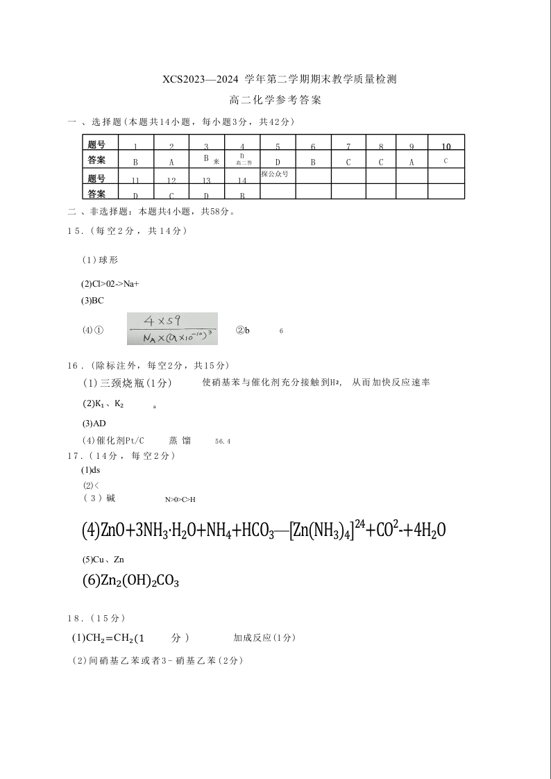 河南省许昌市高2025届下学期7月期末教学质量检测化学答案