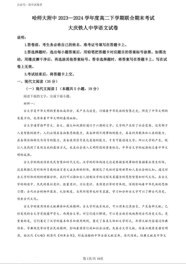 黑龙江省哈尔滨师范大学附属中学、大庆铁人中学2025届下学期期末联考语文(原卷版)