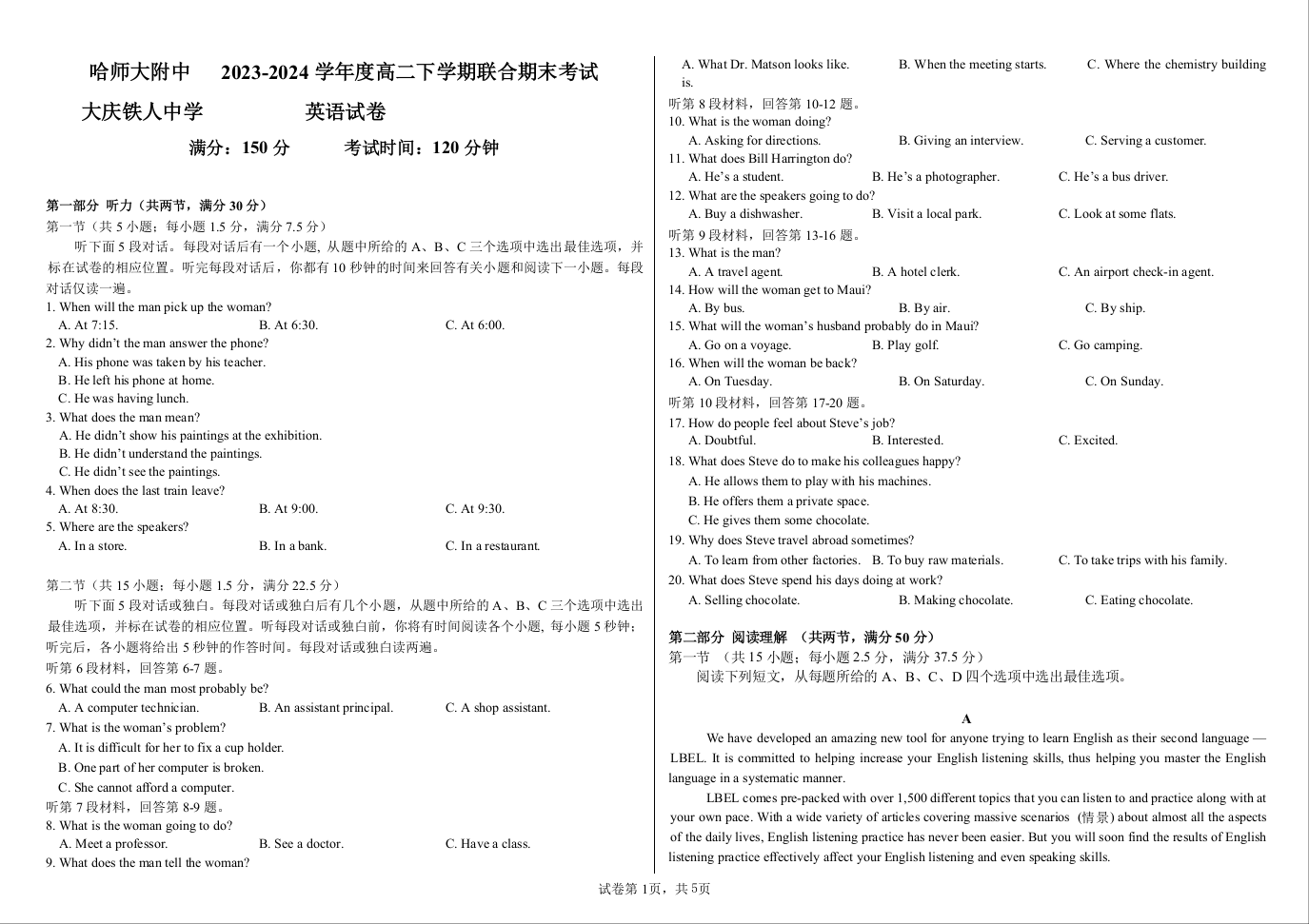 黑龙江省哈尔滨师范大学附属中学、大庆铁人中学2025届下学期期末联考英语