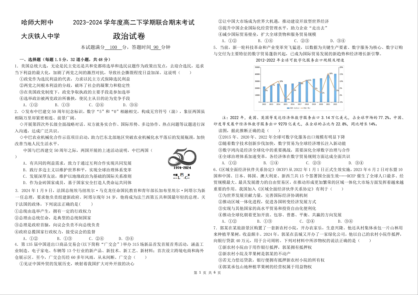 黑龙江省哈尔滨师范大学附属中学、大庆铁人中学2025届下学期期末联考政治