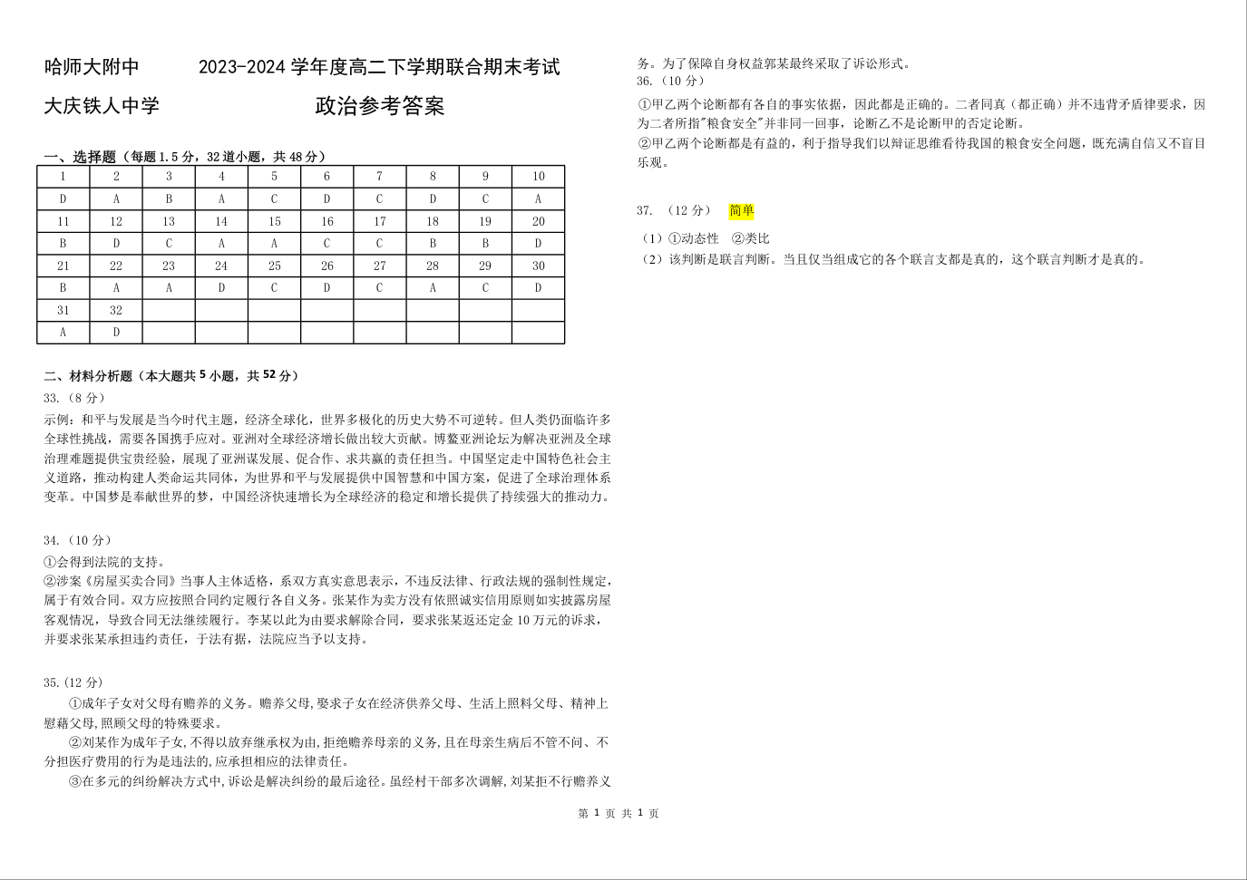 黑龙江省哈尔滨师范大学附属中学、大庆铁人中学2025届下学期期末联考政治答案