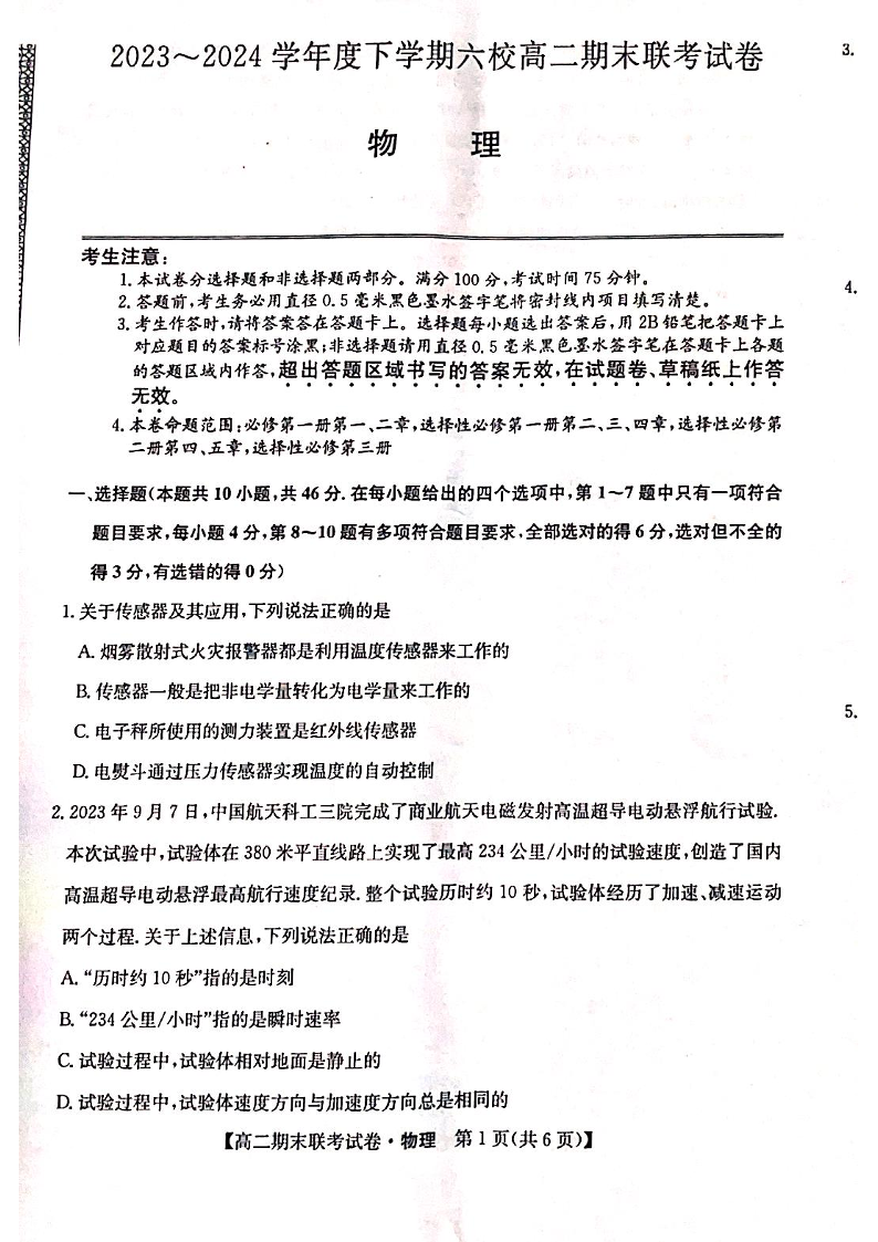 黑龙江省哈尔滨市六校高2025届下学期7月期末联考物理+答案