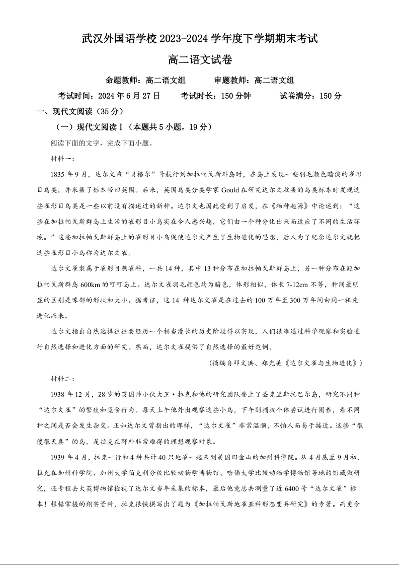 湖北省武汉外国语学校高2025届下学期期末考试语文(解析版)
