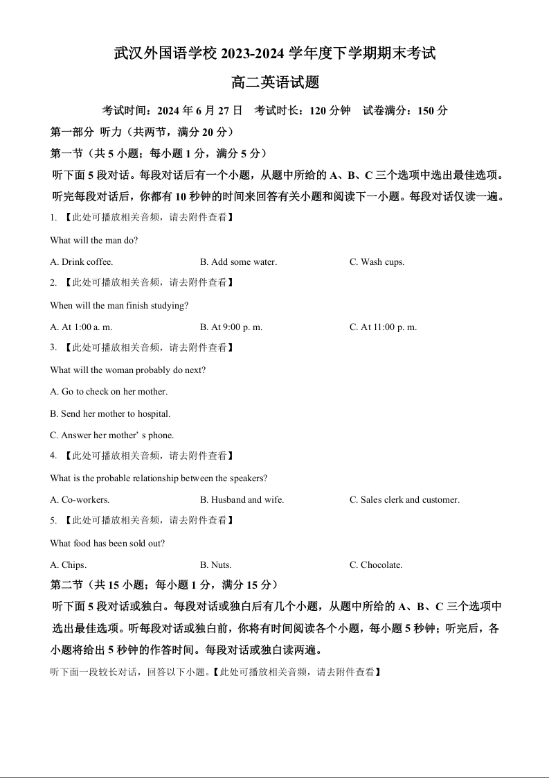 湖北省武汉外国语学校高2025届下学期期末考试英语(原卷版)