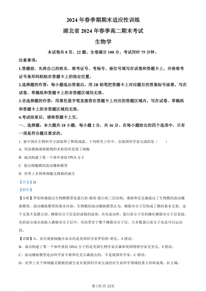 湖北省部分市州高2025届年级期末教学质量监测生物(精品解析版)