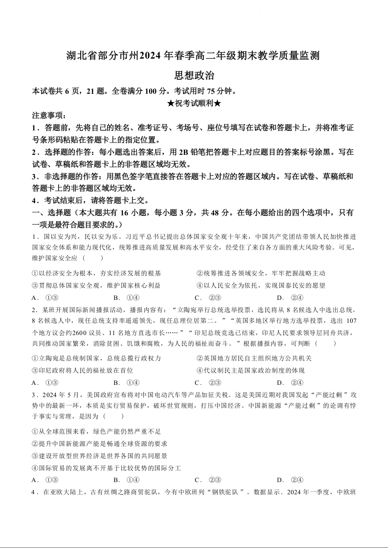 湖北省部分市州高2025届年级期末教学质量监测政治
