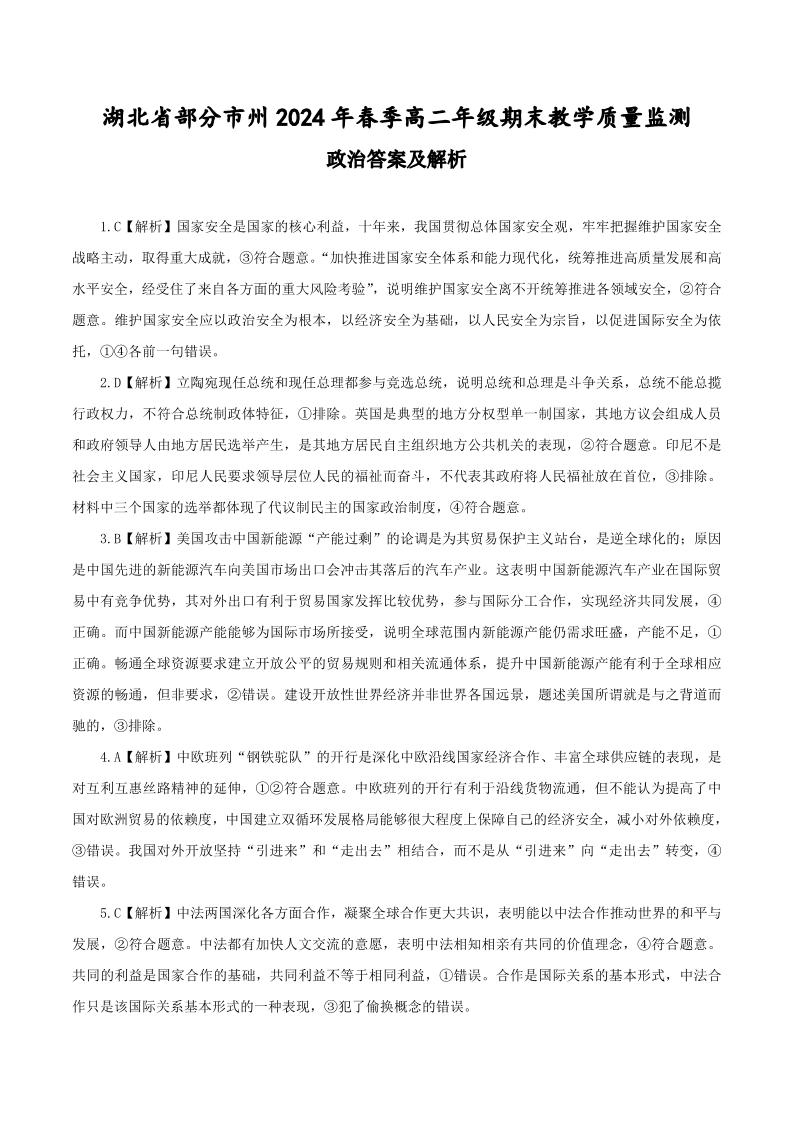 湖北省部分市州高2025届年级期末教学质量监测政治答案