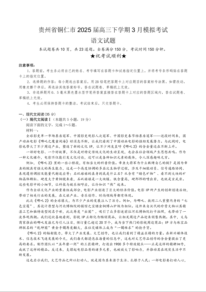 贵州省铜仁市2024-2025学年下学期3月高三模拟考试语文+答案
