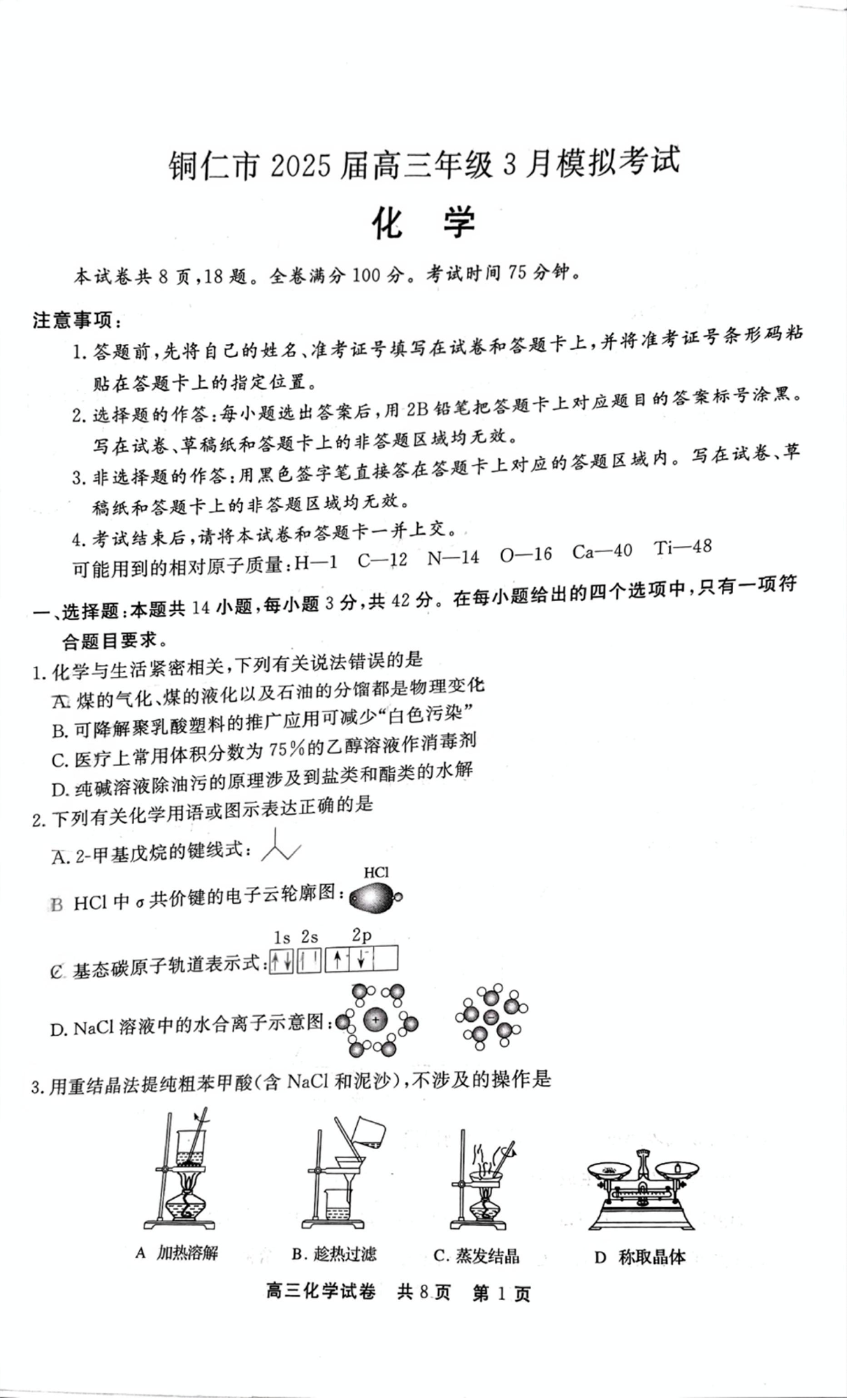 贵州省铜仁市2024-2025学年下学期3月高三模拟考试化学+答案